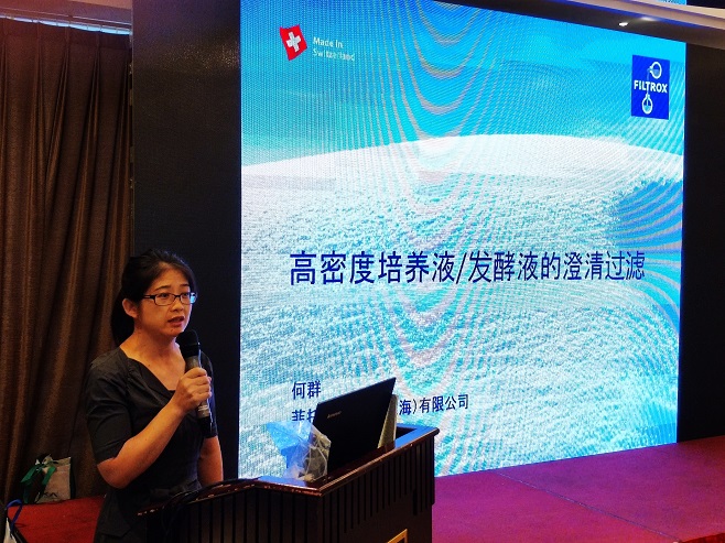 Filtrox公司营销总监何群对“高密度培养液/发酵液的澄清过滤方案”进行主题演讲