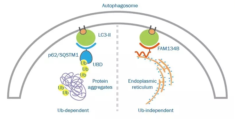 泛素依赖性自噬:选择性自噬受体通过泛素结合域(UBD)与泛素化的分子相互作用。这种选择性自噬通路与泛素-蛋白酶体系统相互作用,以消除蛋白聚集物。许多其他细胞成分通过这些受体被靶向降解。影响与分子相互作用的受体特异性的因素尚未完全阐明。值得注意的是受体的选择性有很大部分的重叠。