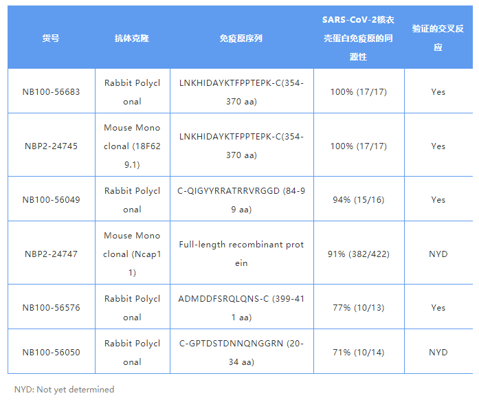 SARS-CoV-2 与 SARS-CoV 的核衣壳蛋白具有 91% 的序列同源性。Novus Biologicals® 提供了几种用于检测 SARS-CoV 核衣壳蛋白的抗体,这些抗体可用于 WB、ICC / IF、ELISA 等多种应用。