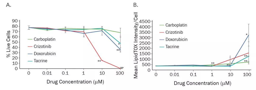 图 3  使用 StemXVivo Hepatocyte Differentiation Kit 将 iPSK3 人诱导多能干细胞再分化为肝细胞样细胞,并将细胞接种于 96 孔板中,使用肝毒性化合物(Carboplatin、Doxorubicin、Crizotinib、Tacrine)进行筛选。细胞活力(A)和脂质代谢(B)分析表明,肝毒性化合物对 iPSCs 衍生的肝细胞的毒性具有剂量依赖性。