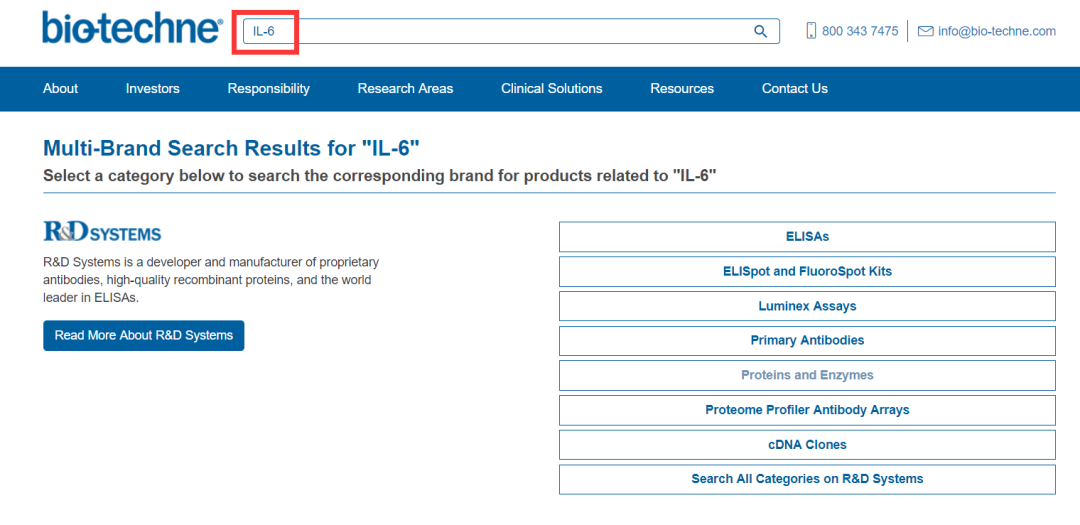 此时,Bio-Techne 旗下 R&D Systems®,Novus Biologicals®,Tocris®,ProteinSimple® 都列出了包含 IL-6 的所有产品类型(下图仅列出了 R&D Systems® 品牌的相关产品)。