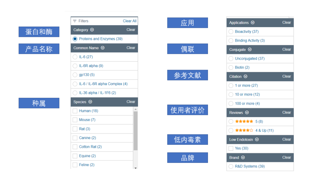点击「Proteins and Enzymes」,进入到如下页面,可以看到有 39 个产品,下图对 Filters 中的每一栏也作出中文解析,这里重点介绍一下 Applications 中的 Bioactivity 和 Binding activity 的含义: