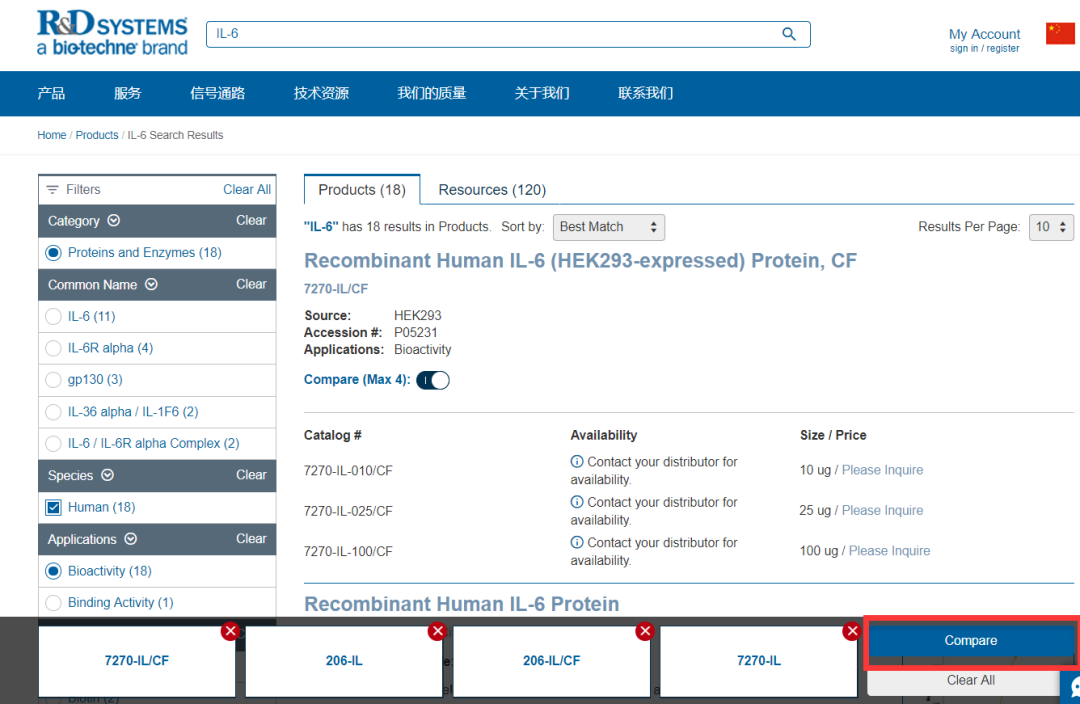 这里也告诉大家 R&D Systems®对比产品的独门秘籍:「Compare」功能,最多可以选择 4 个产品,我们以页面上的前 4 个产品为例,选取之后,点击右下角的「Compare」,