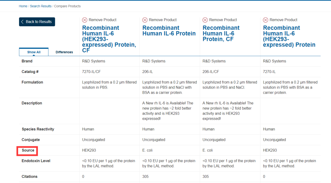 此时会出现这 4 个产品详细的数据对比,该蛋白有 HEK293 和 E.Coli 两个来源:一般来说对原核细胞系(大肠杆菌系统)而言,蛋白没有糖基化,最初可能折叠不正确,但是我们有丰富经验将这些蛋白质重新折叠成正确的结构。