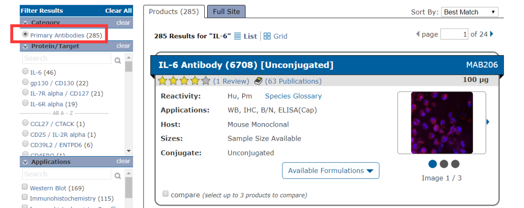 根据上述蛋白的选择方法,首先选择正确的产品名称 Protein/target,发现不仅有 IL-6,还出现了 gp130/CD130、IL-7R alpha/CD127 和 IL-6R alpha。这是因为 IL-6 是一种多效性细胞因子,通过与配体特异性的 IL-6 受体(IL-6R)和共同的信号转导受体(gp130)组成的受体系统发挥生物学功能,所以也会搜索出和 IL-6 相关的抗体。