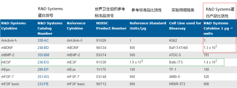 比如人 EGF 蛋白产品(货号 236-EG),1 μg=1.4*103 U,如果文献中所用的浓度为 100 U/mL,换算到该产品的质量浓度就是 100/1400=0.07 μg/mL。
